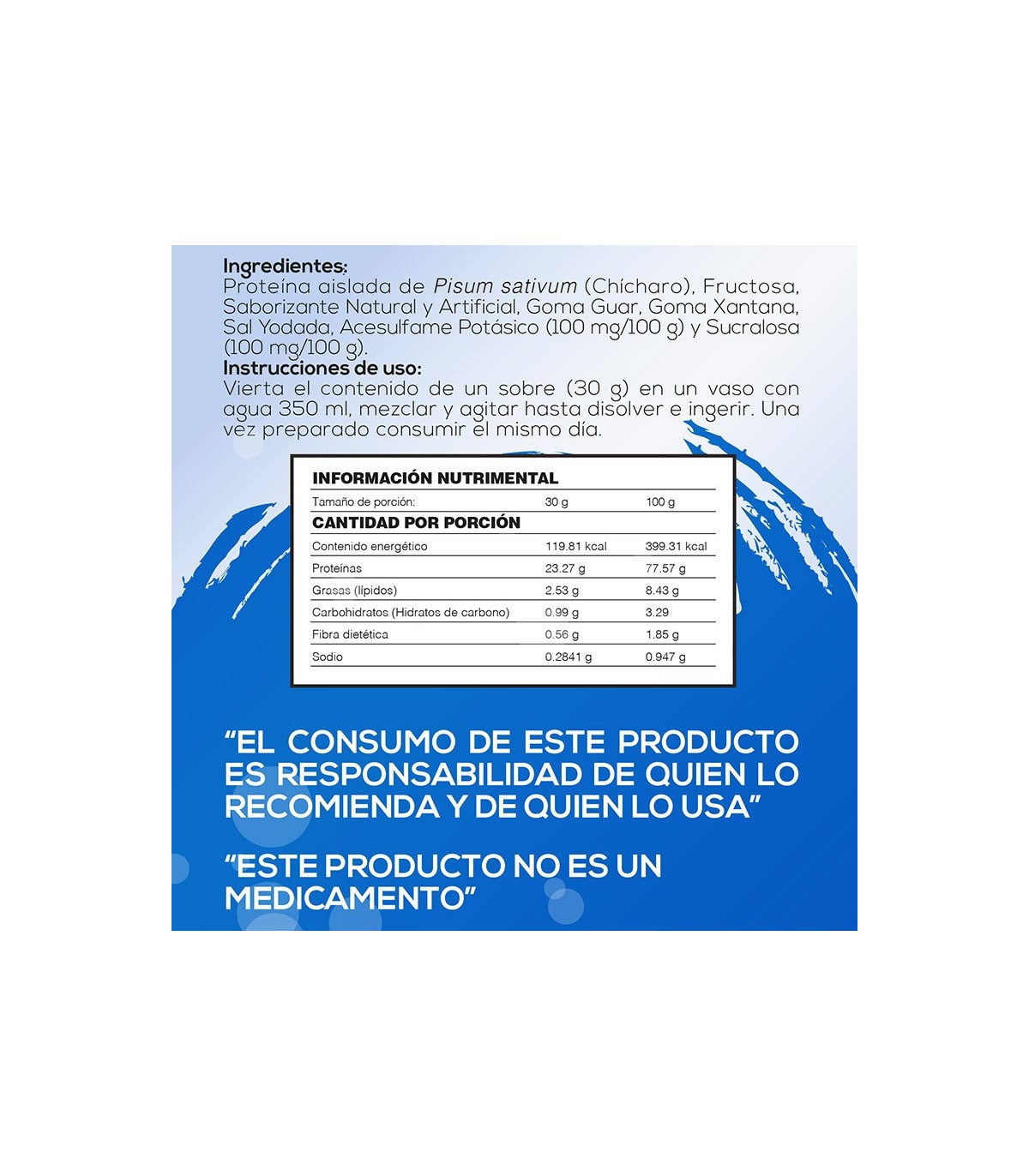 Proteína aislada de chícharo. fructuosa cristalina, saborizante natural y artificial, goma guar, goma xantana, sal, acesulfame de potasio, sucralosa.